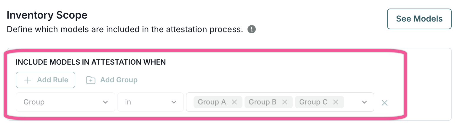 Define which models are included in the attestation process. By default, all models are included. Use filters to narrow the scope based on model fields, stages, or custom attributes.