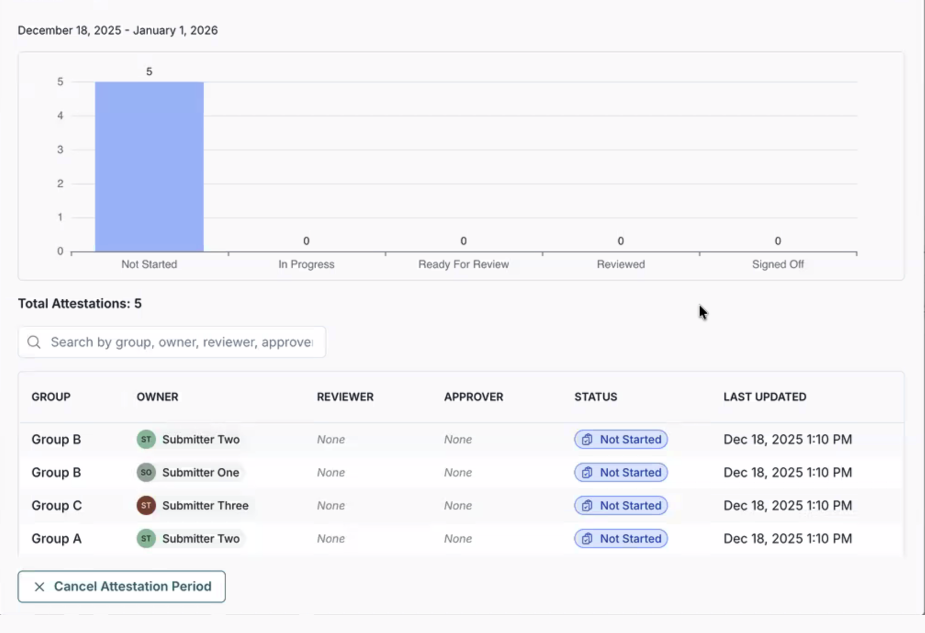 - Attestation table — Columns for Group, Owner, Reviewer, Approver, Status, and Last Updated