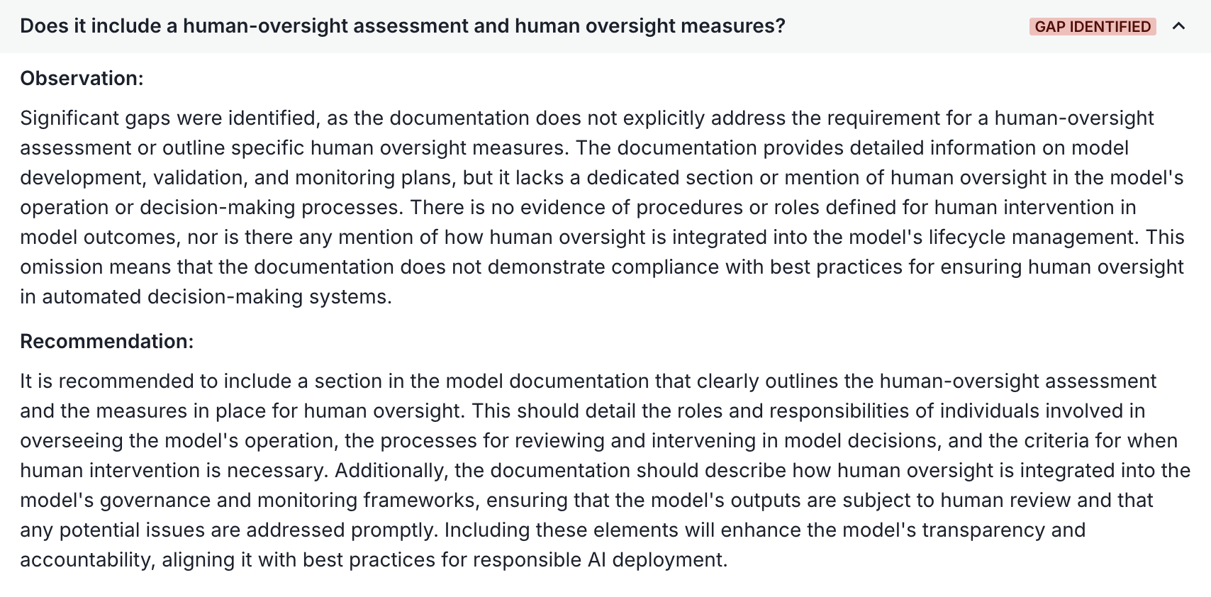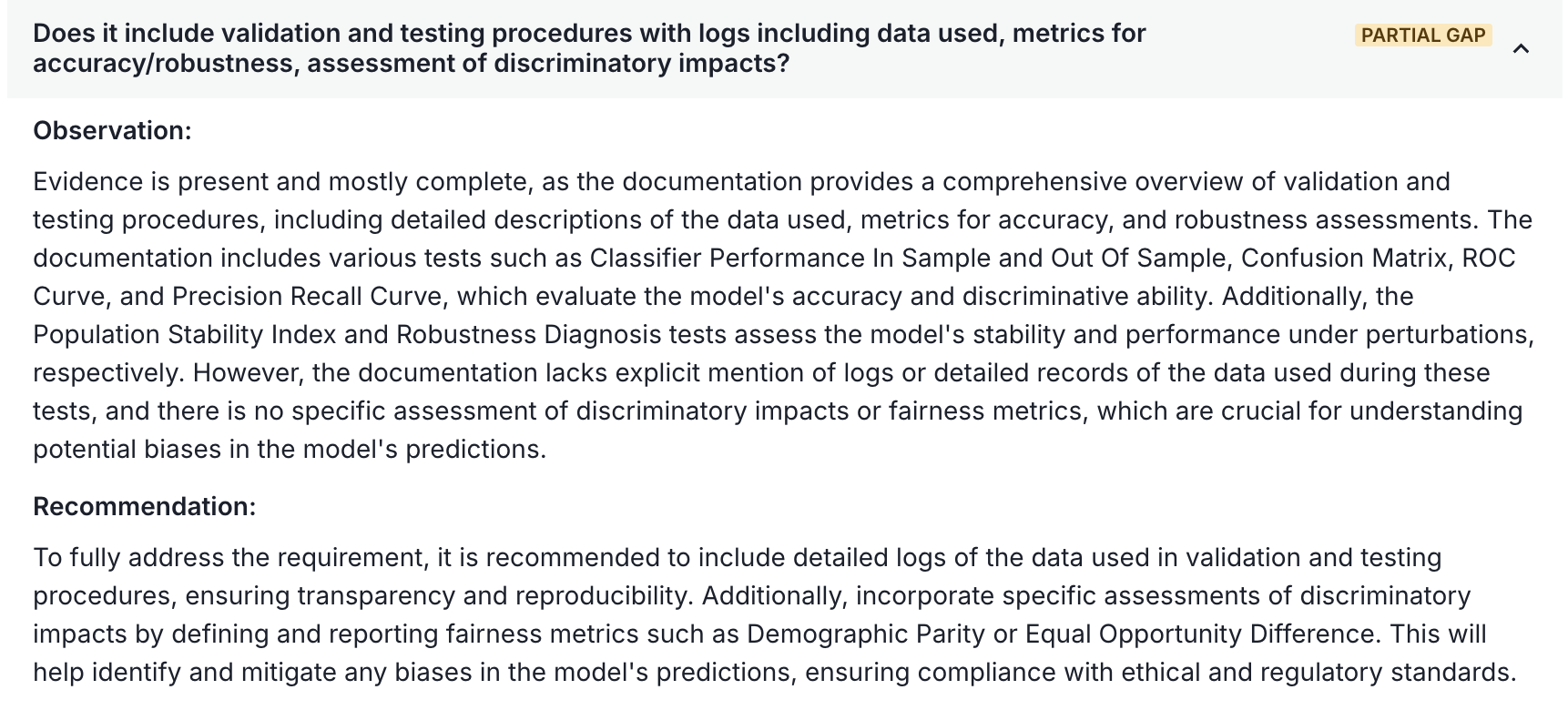 A screenshot showing the question 'Is the documentation sufficient to allow an expert to adjust parameters?' and the observation 'Gap identified' with a recommendation to add a policy paragraph.