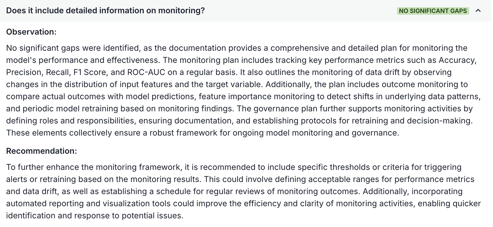A screenshot showing the question 'Is the documentation sufficient to allow an expert to adjust parameters?' and the observation 'No significant gaps.' with a recommendation to add a policy paragraph.