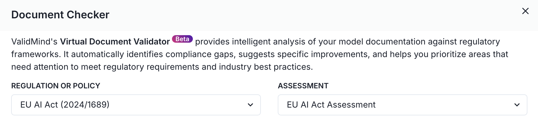 1. In the Document Checker modal, select a regulation and an associated assessment from the drop-down menus to to check your document against: