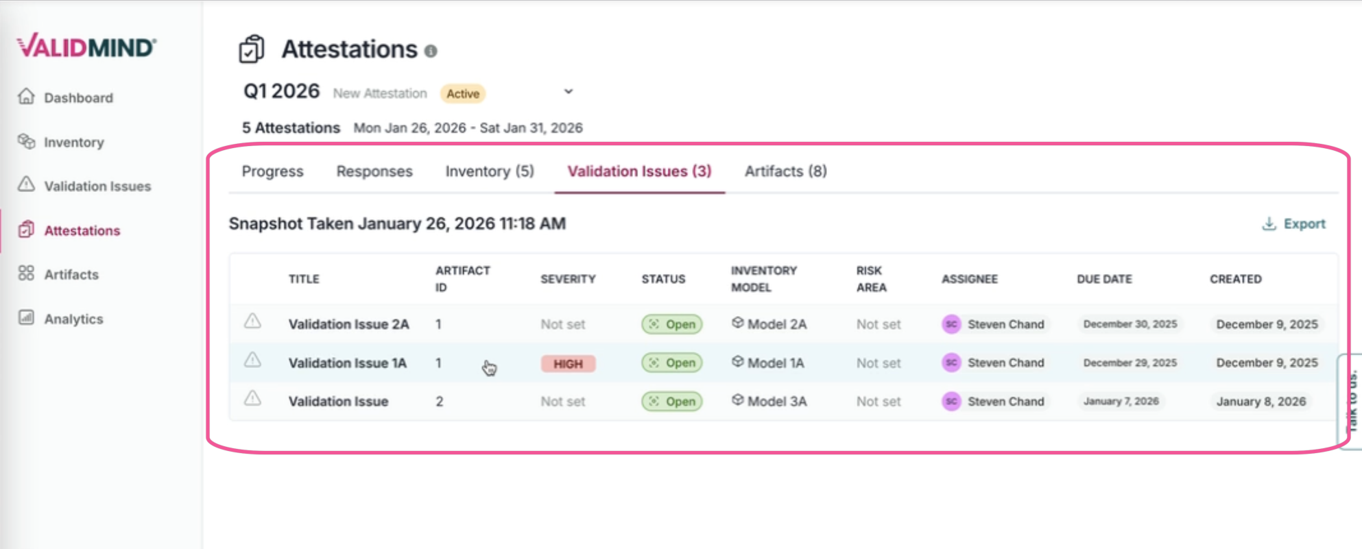 - View model and artifact snapshots captured at both the beginning and completion of each attestation period, enabling comparative analysis to confirm inventory completion and accuracy.