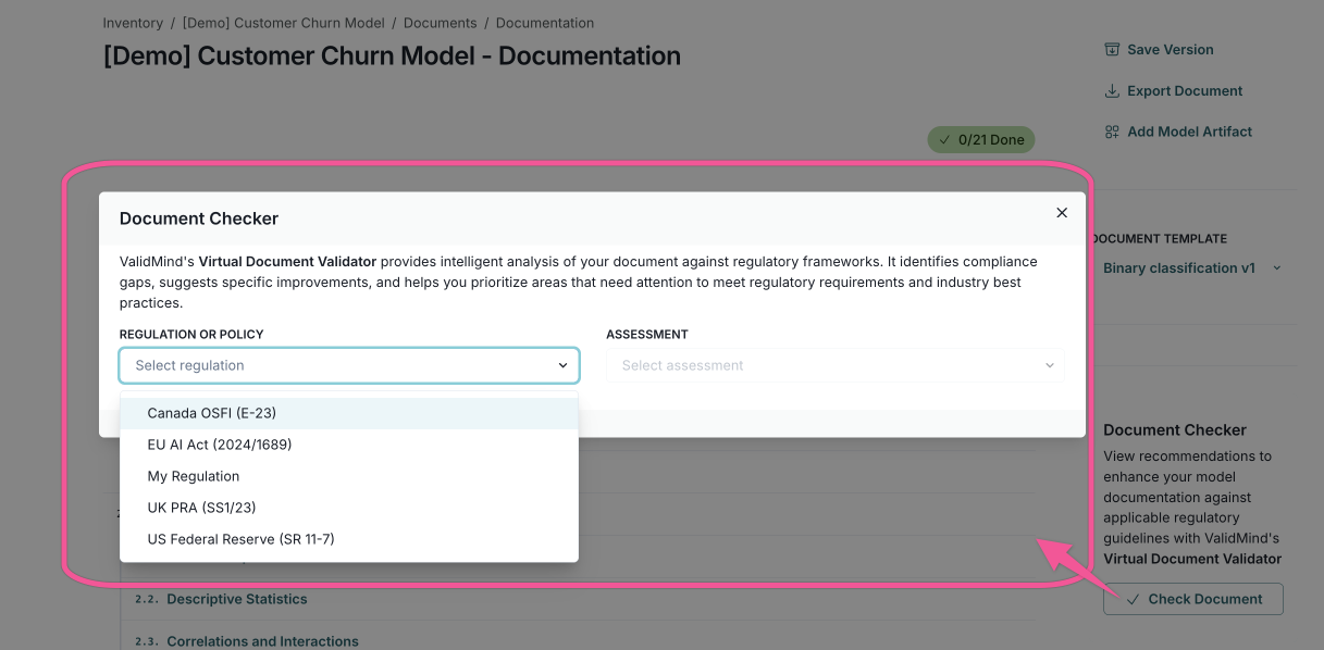 The Document Checker, also known as the Virtual Document Validator, is a compliance tool that reviews documents against a selected regulatory standard, such as SR 11-7, SS1/23, E-23, and the EU AI Act. Use Document Checker to identify gaps, generate actionable recommendations, and focus efforts on areas that require attention.