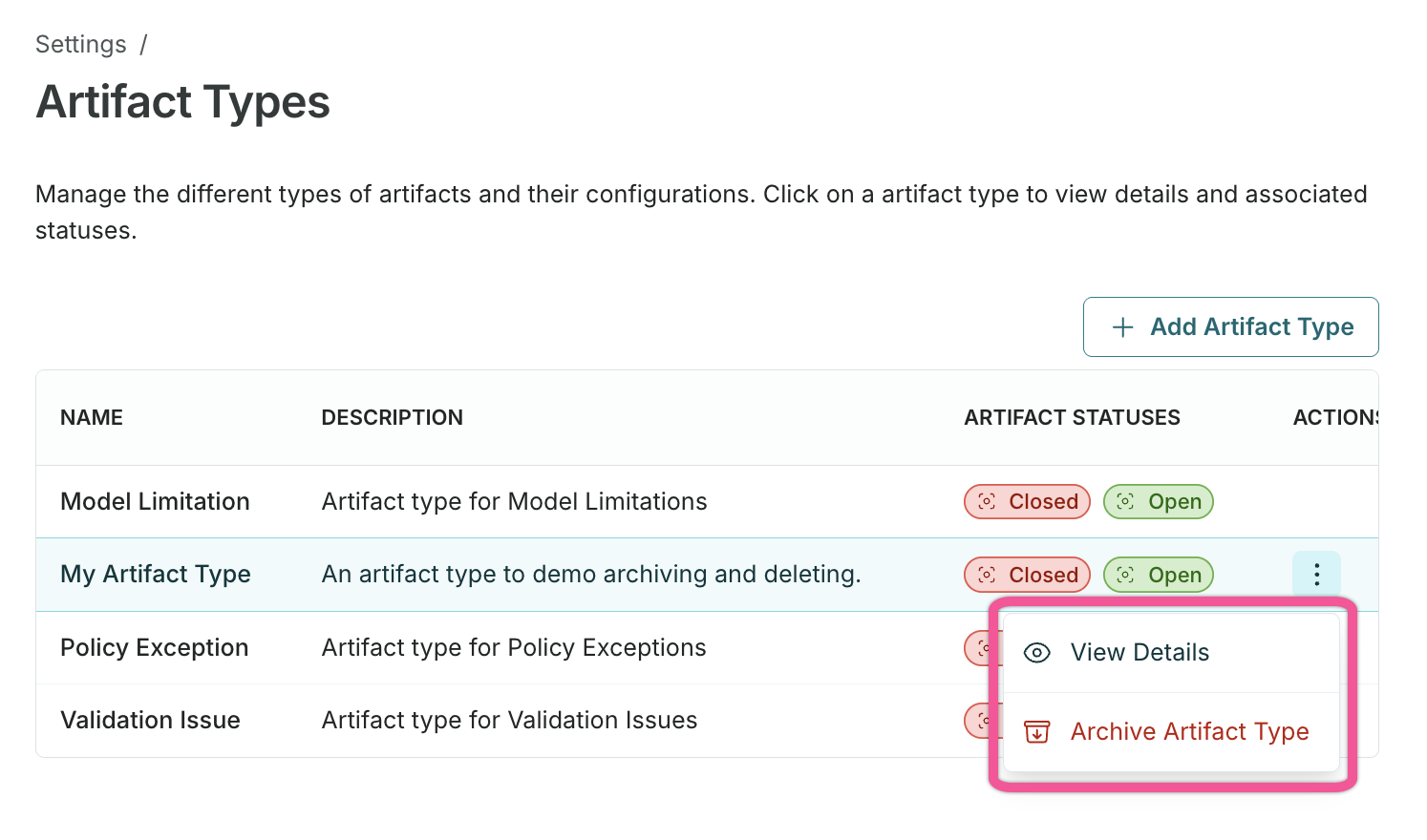 • Archive artifact types to hide them from new artifact creation. Existing artifacts of default types will be also be hidden from view.
