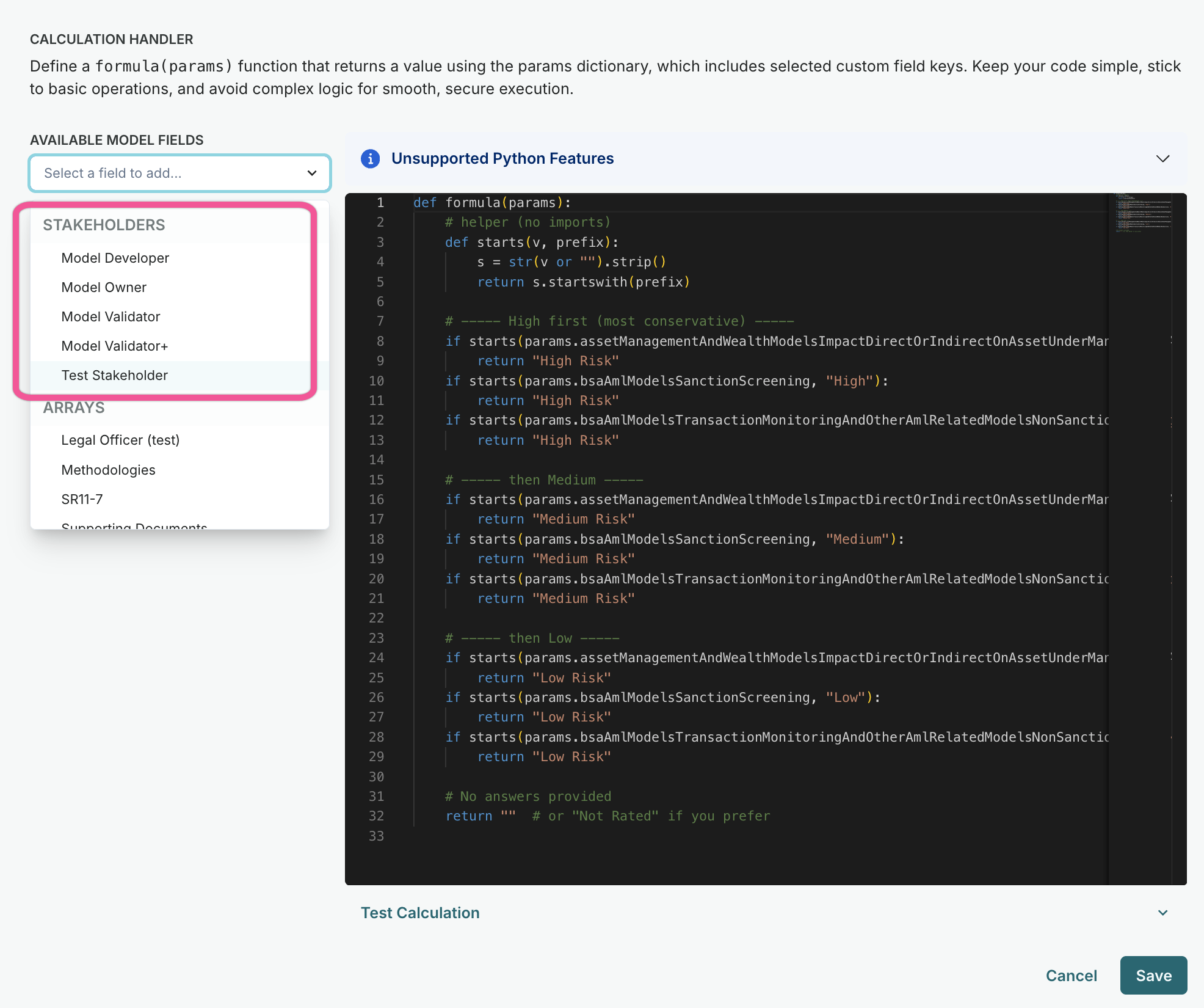 • Model stage: Use the current model stage value in calculations, enabling dynamic fields that update when models progress through lifecycle stages.