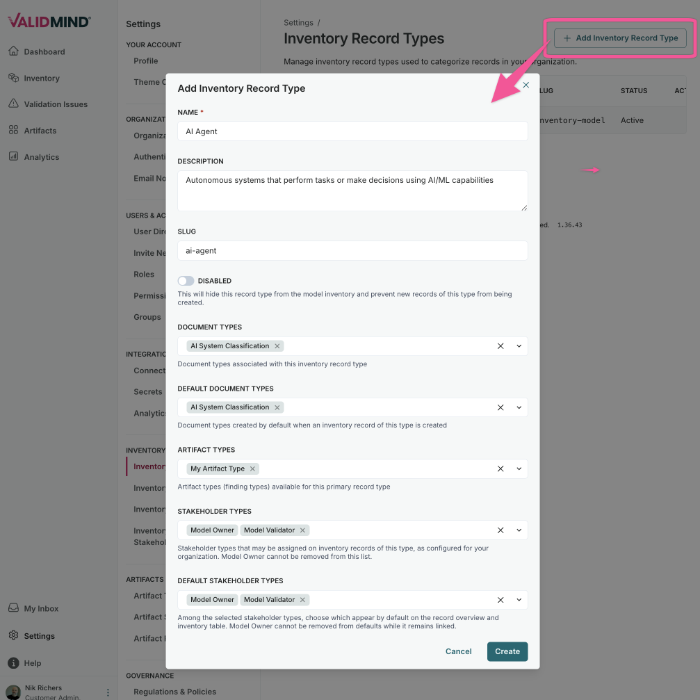 • Create custom record types for different governance needs like analytics models, attestations, or AI agents.