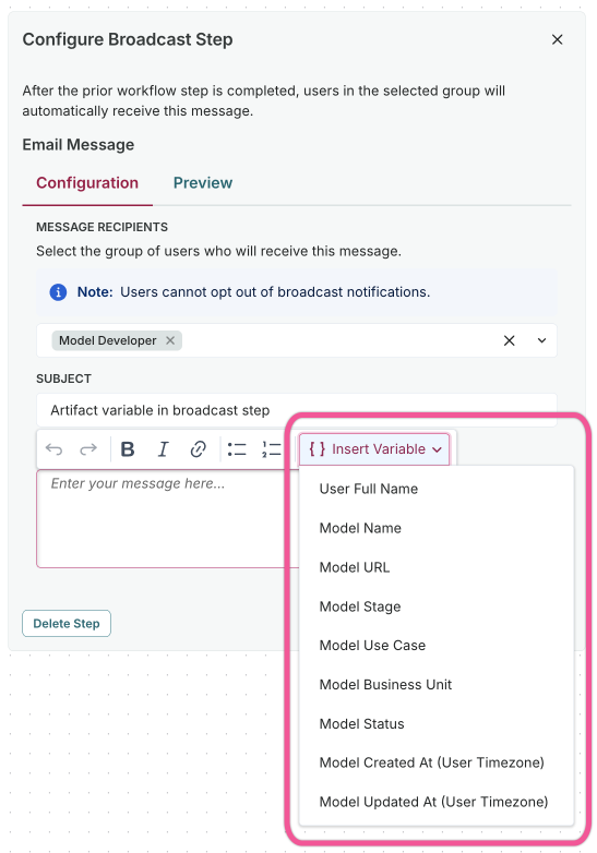 Broadcast step variable inputs are now based on the record or artifact type the workflow is tied to, including field values and stakeholders. For example, a Validation Issue workflow can reference Validation Issue fields and stakeholders, while a Use Case workflow can reference Use Case fields and stakeholders.
