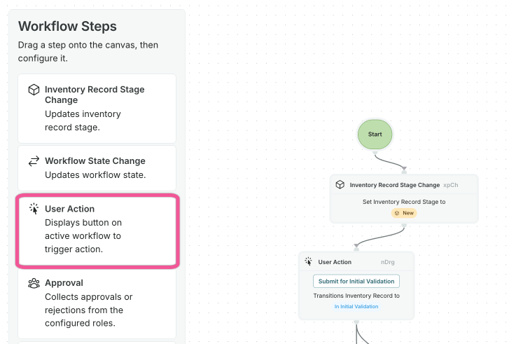 The workflow step previously labeled User Action v2 is now simply called User Action. The legacy User Action step has been removed.